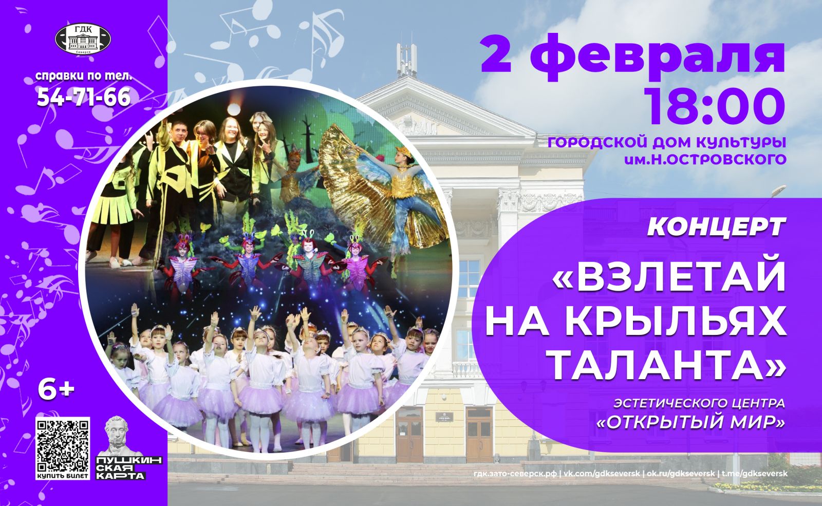 2 февраля в 18:00 в Городском доме культуры им.Н.Островского состоится концерт «Взлетай на крыльях таланта» Эстетического центра «Открытый мир» (0+).