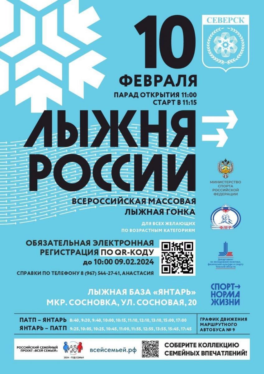 В субботу, 10 февраля, на лыжной базе «Янтарь» (мкр.Сосновка, ул.Сосновая, 20) пройдет 42 открытая Всероссийская массовая лыжная гонка «Лыжня России – 2024» в ЗАТО Северск!