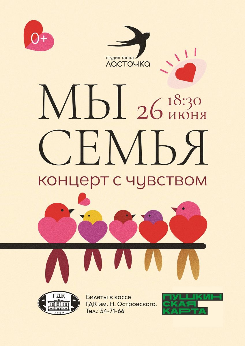 26 июня в 18:30 в Большом зале Городского дома культуры им.Н.Островского состоится отчётный концерт Студии танца «Ласточка» - «Мы семья».