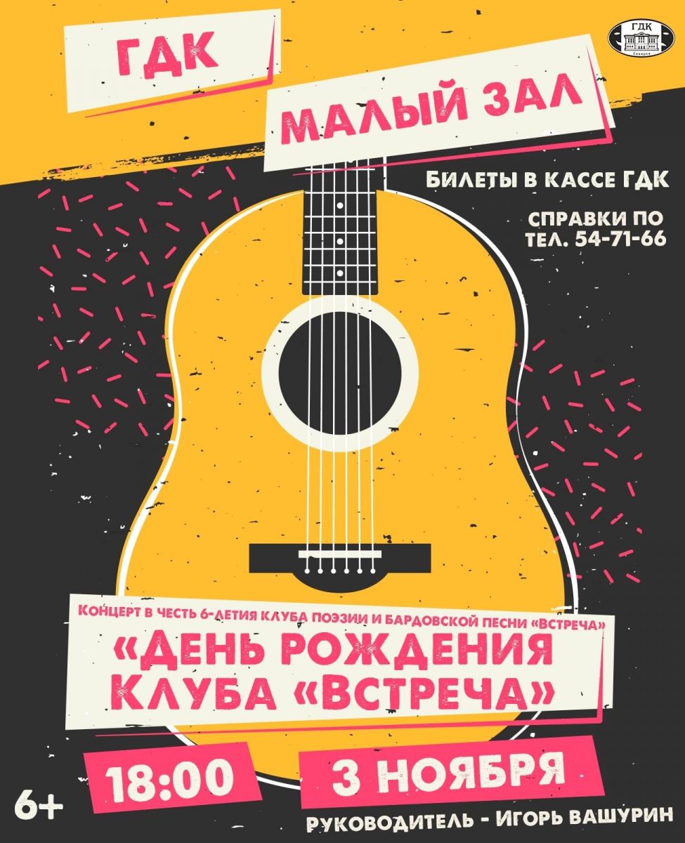3 ноября Клуба поэзии и бардовской песни «Встреча» отмечает свой 6-й день рождения и ждет встречи со своими друзьями и поклонниками на концерте в честь приятного события. Самодеятельные певцы, поэты и музыканту готовят большую праздничную программу, в которой прозвучат произведения известных российских бардов, авторские песни на стихи клубных поэтов.