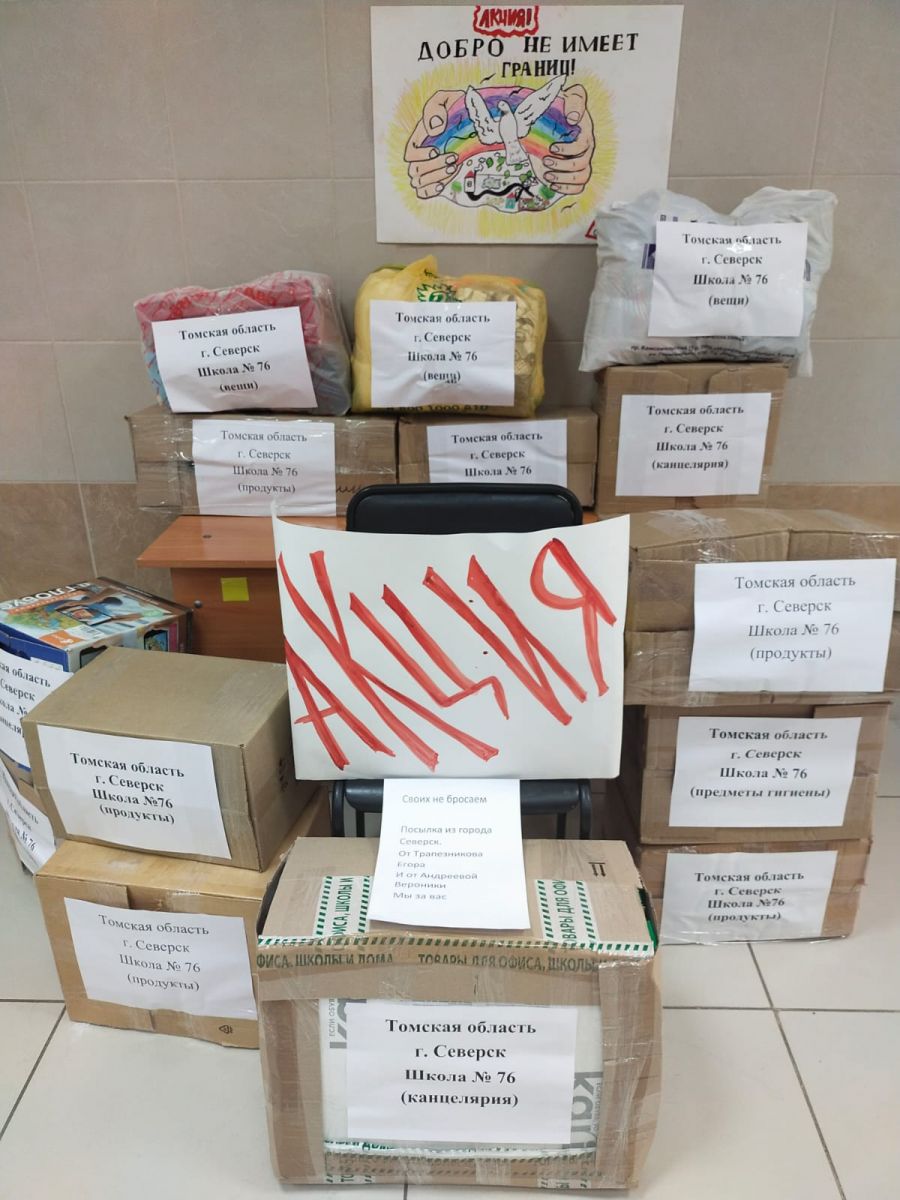 Сбор гуманитарной помощи для жителей Донбасса организован во всех образовательных организациях Северска. В рамках социальной акции "Мы вместе " сотрудники школ и детских садов нашего города собрали порядка 3 тысяч кг гуманитарной помощи. Для граждан, попавших в трудную жизненную ситуацию, переданы продукты питания, средства гигиены, одежда.