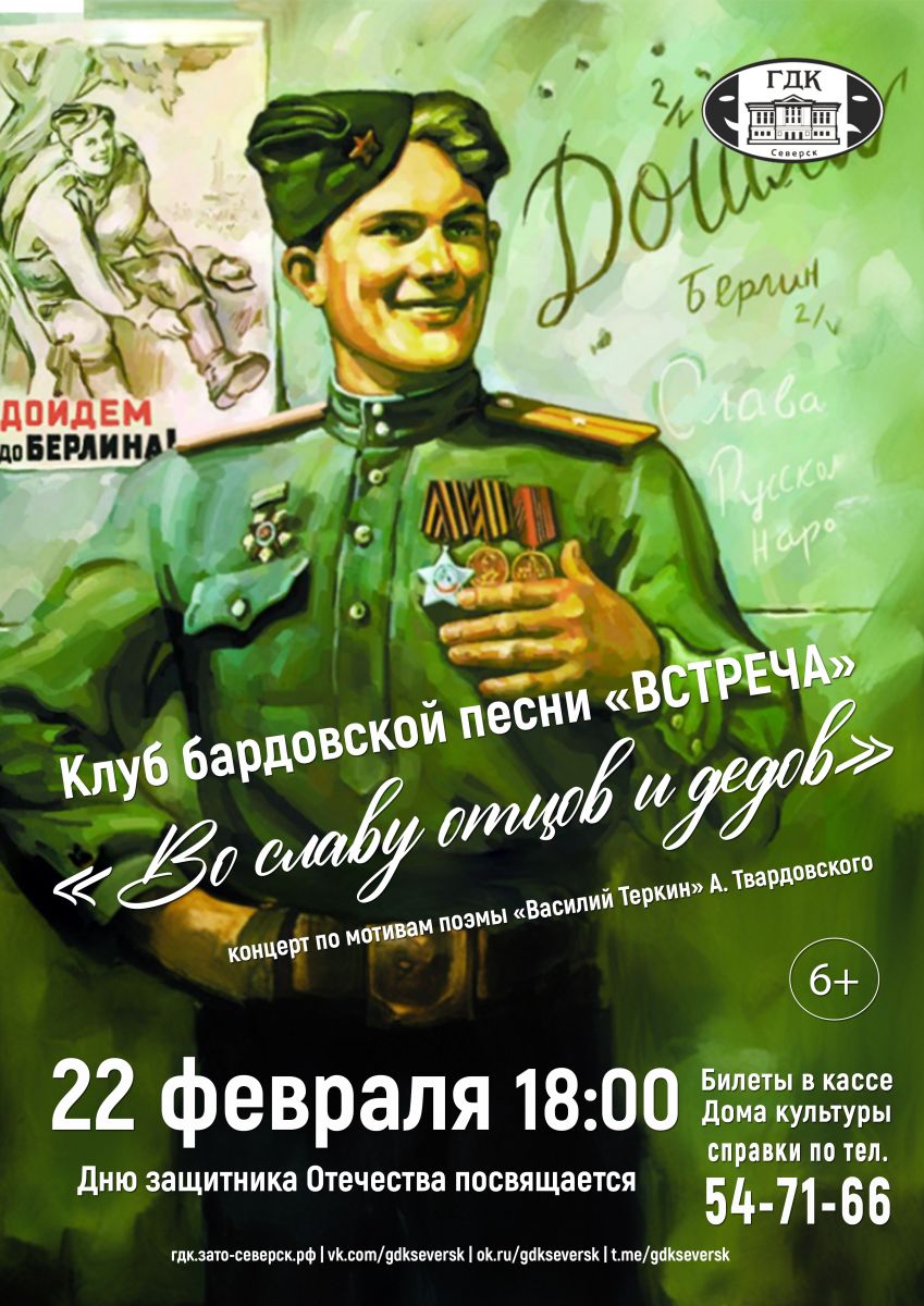 22 февраля в 18:00 в Малом зале Городского дома культуры им.Н.Островского состоится концерт «Во славу отцов и дедов» (6+) Клуба бардовской песни «Встреча». Этот концерт продолжит традицию проведения ежегодных выступлений коллектива, посвященных празднованию Дня защитника Отечества.