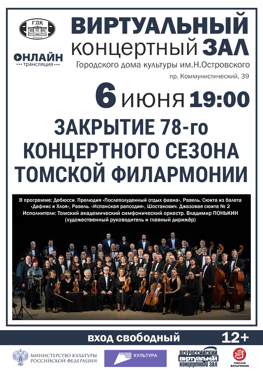 6 июня в 19:00 в Виртуальном концертном зале Городского дома культуры им.Н.Островского состоится трансляция концерта, завершающего 78-й концертный сезон Томской филармонии (12+).