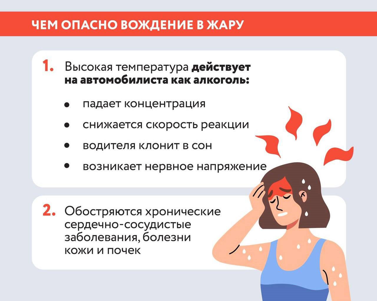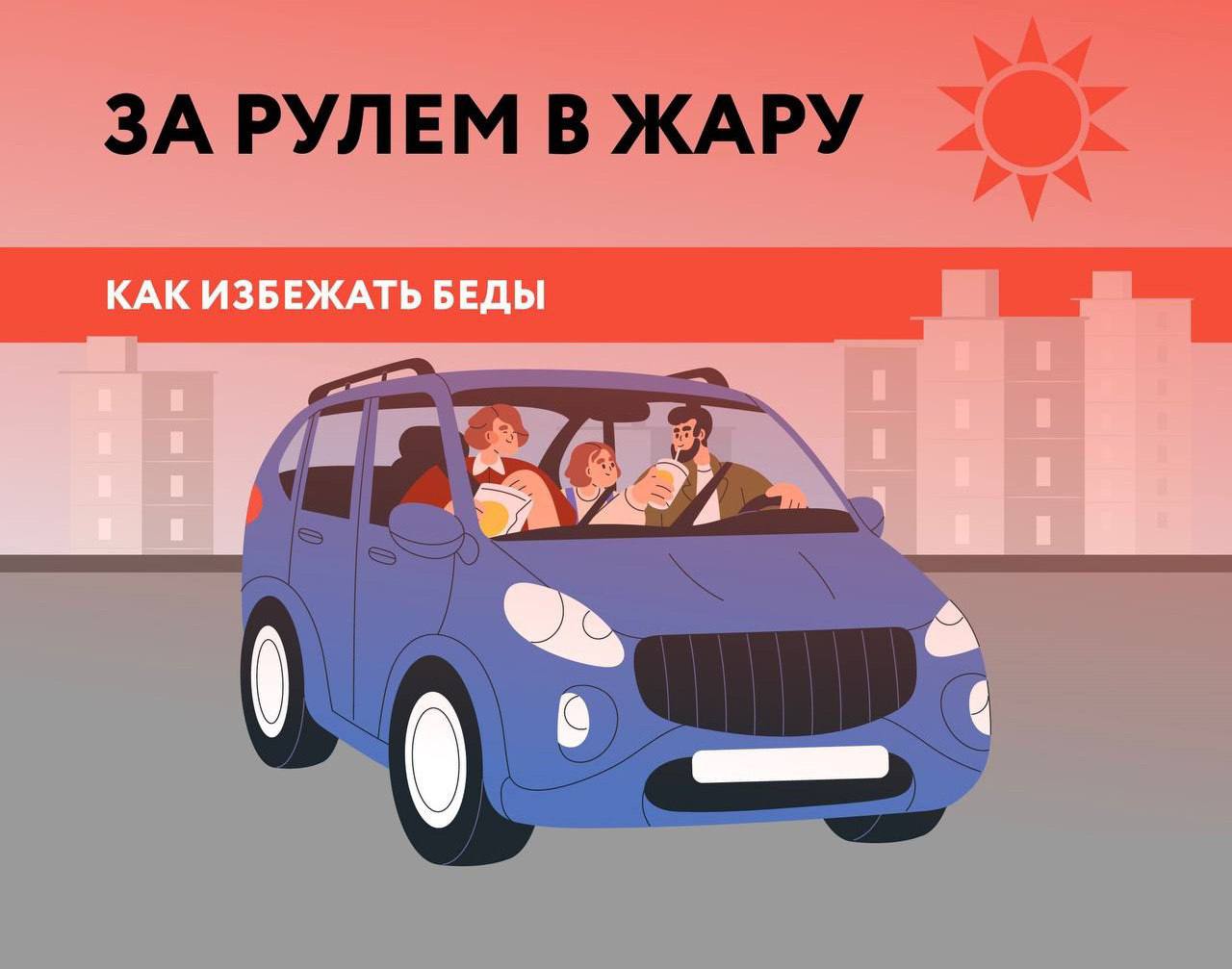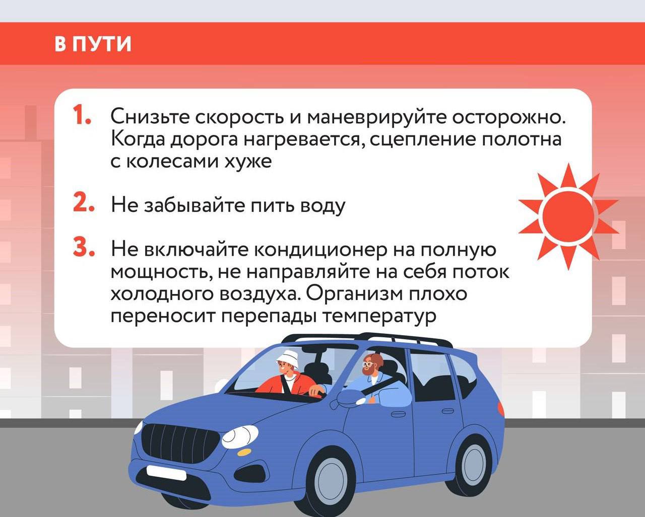 Информация о том, как безопасно передвигаться на автомобиле в жарку погоду — в карточках.