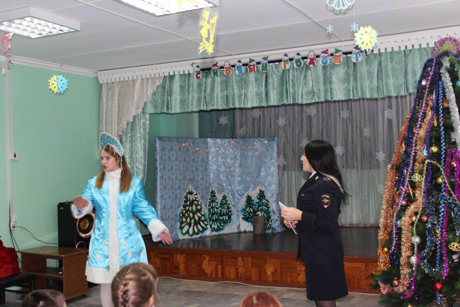 В рамках акции «Полицейский Дед Мороз» сотрудники и общественники провели для ребят праздничное мероприятие. В костюмах сказочных персонажей полицейские в игровой форме повторили с ребятами основные правила безопасности в зимний период на дорогах, рассказали о важности законопослушного поведения. Ребята вместе с полицейскими исполнили новогоднюю песню «В лесу родилась елочка».