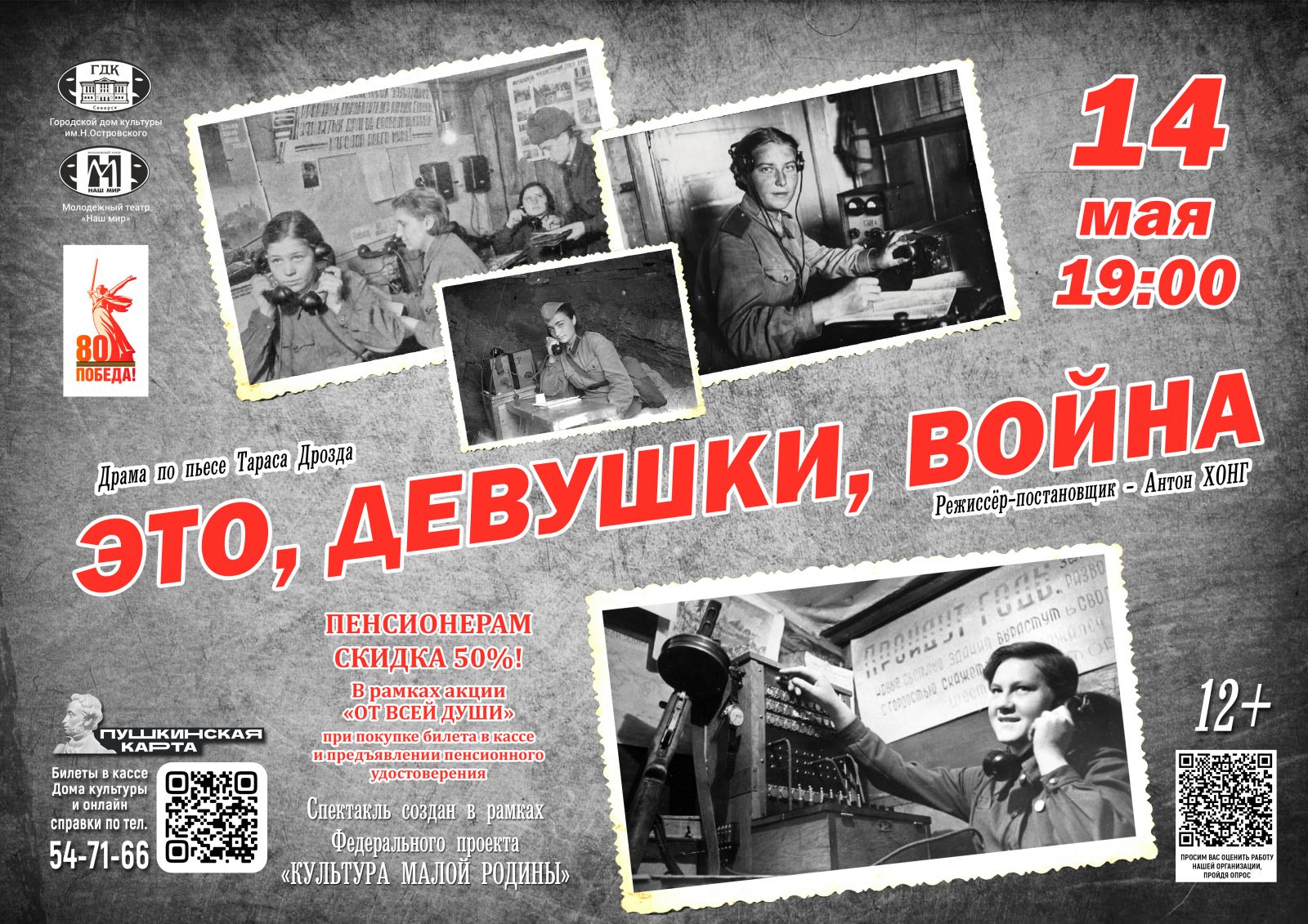 14 мая в 19:00 в Городском доме культуры им.Н.Островского состоится спектакль «Это, девушки, война» (12+) по пьесе драматурга Тараса Дрозда.