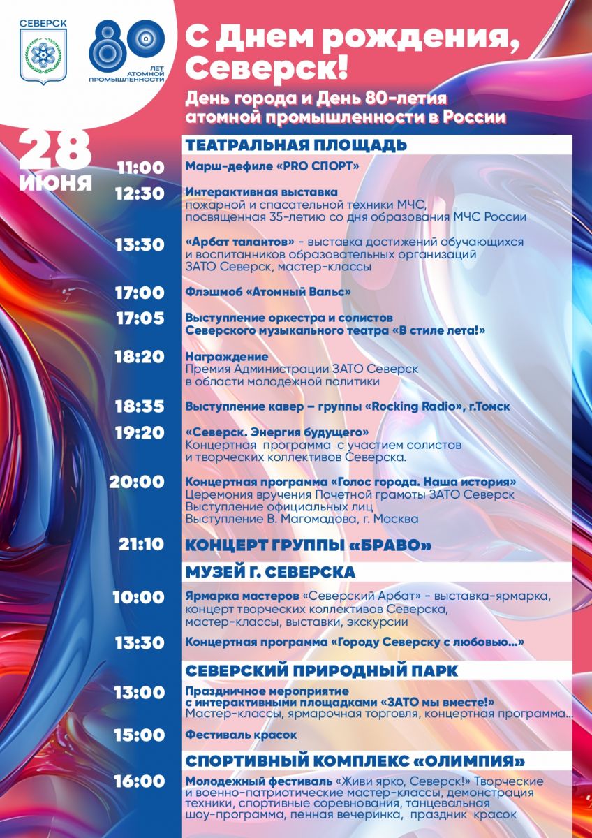 Программа праздничных мероприятий в честь Дня города и 80-летия атомной промышленности.