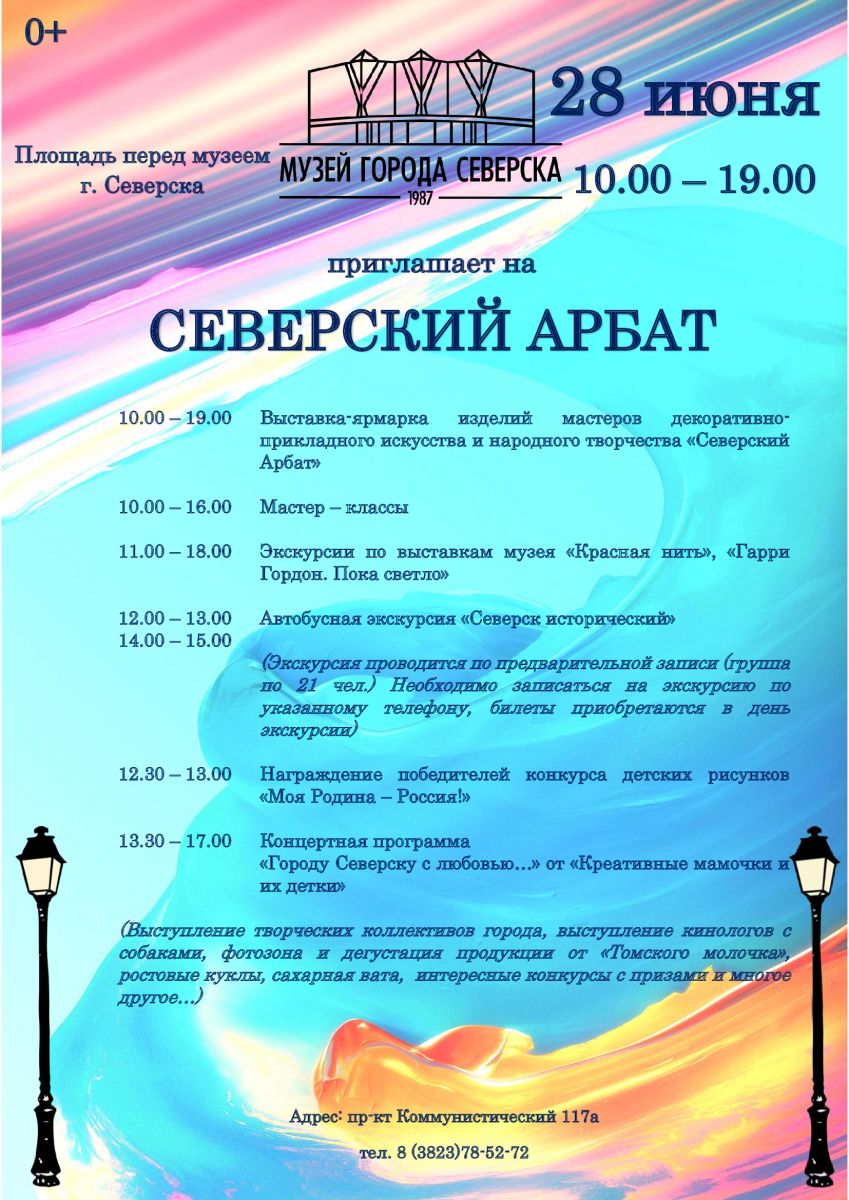 28 июня перед центральным входом в музей города Северска («Северский Арбат») состоится праздничное мероприятие, посвященное Дню города и Дню молодежи.