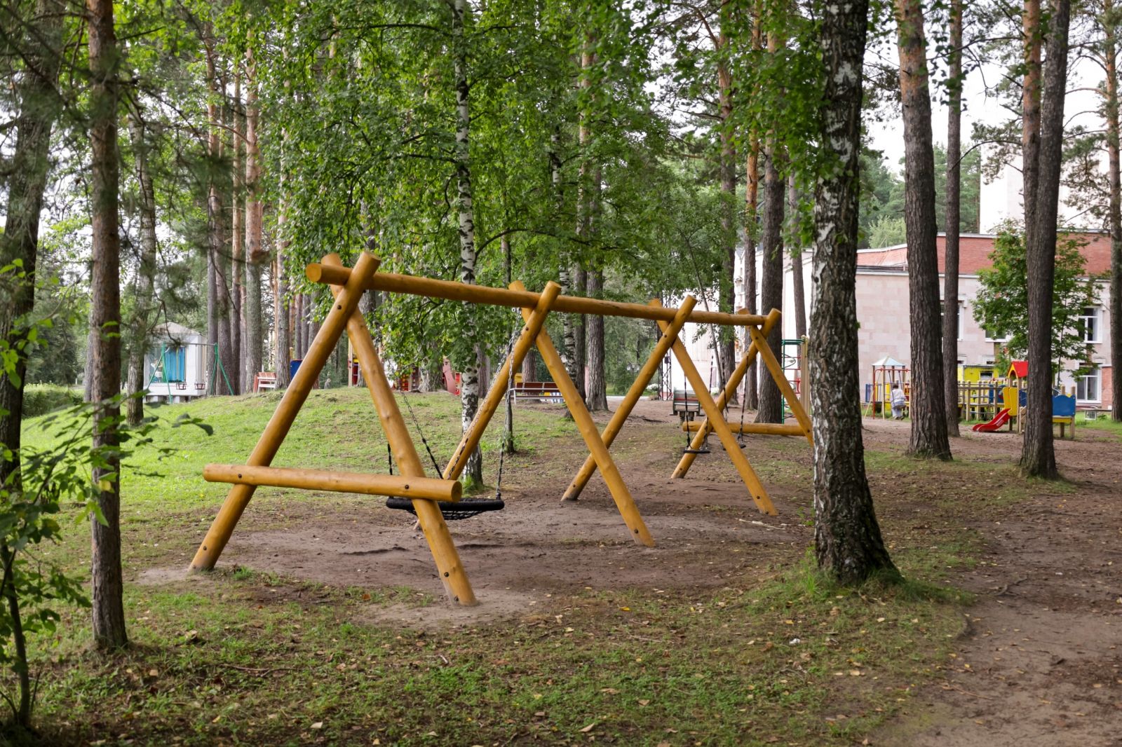 В сквере у дома по проспекту Коммунистическому, 77, обустроены пешеходные и детскую велосипедную дорожки, установлены опоры освещения и детские игровые элементы, спланированы газоны.