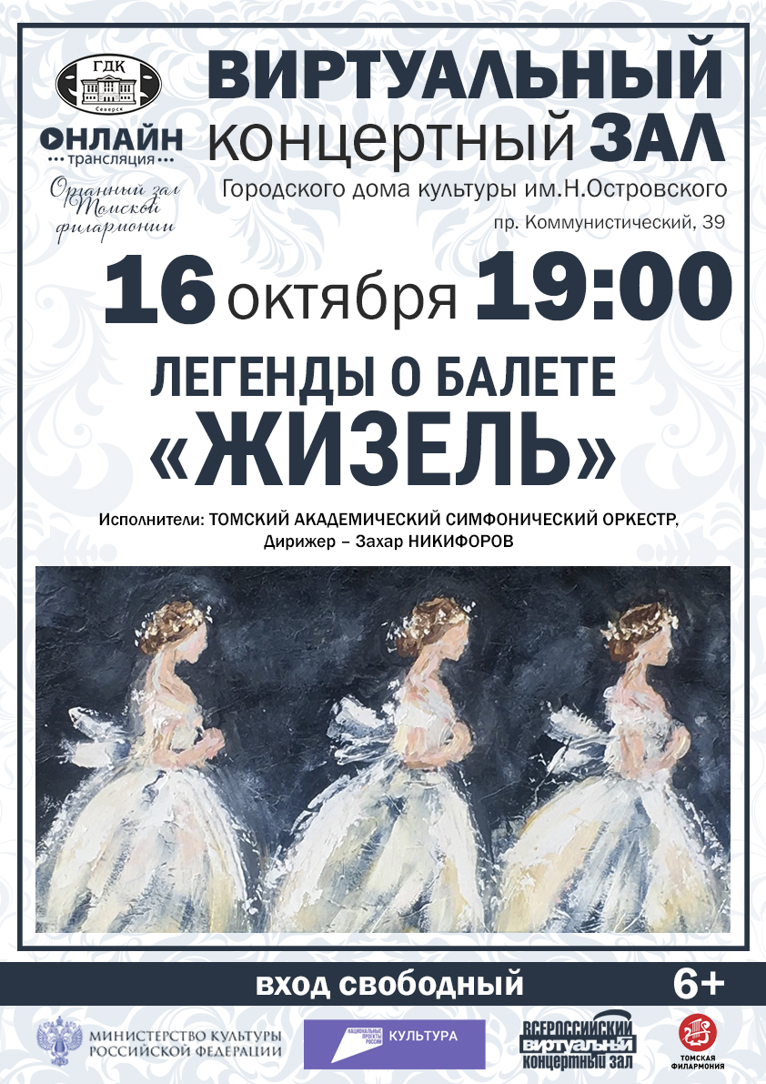 16 октября в 19:00 в Виртуальном концертном зале Городского дома культуры им.Н.Островского состоится трансляция концерта «Легенды о балете. Жизель» (6+) из Органного концертного зала Томской филармонии.