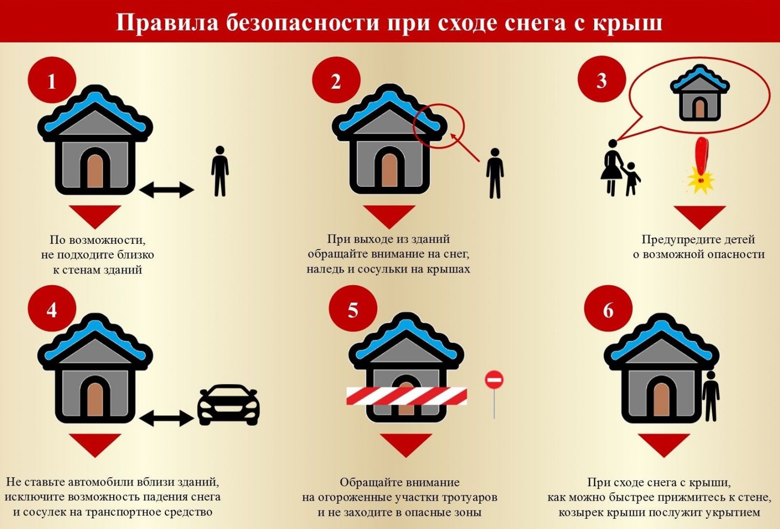 Не приближаться к зданиям, с которых возможен сход снега, падение наледи и сосулек и не позволять этого детям. Если проходя рядом со зданием, Вы услышите шум сверху – прижмитесь к стене.