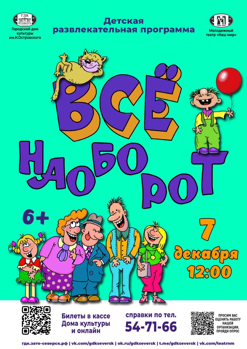 7 декабря в 12:00 в Городском доме культуры им.Н.Островского пройдёт игровая программа «Всё наоборот» (6+) Молодежного театра «Наш мир».