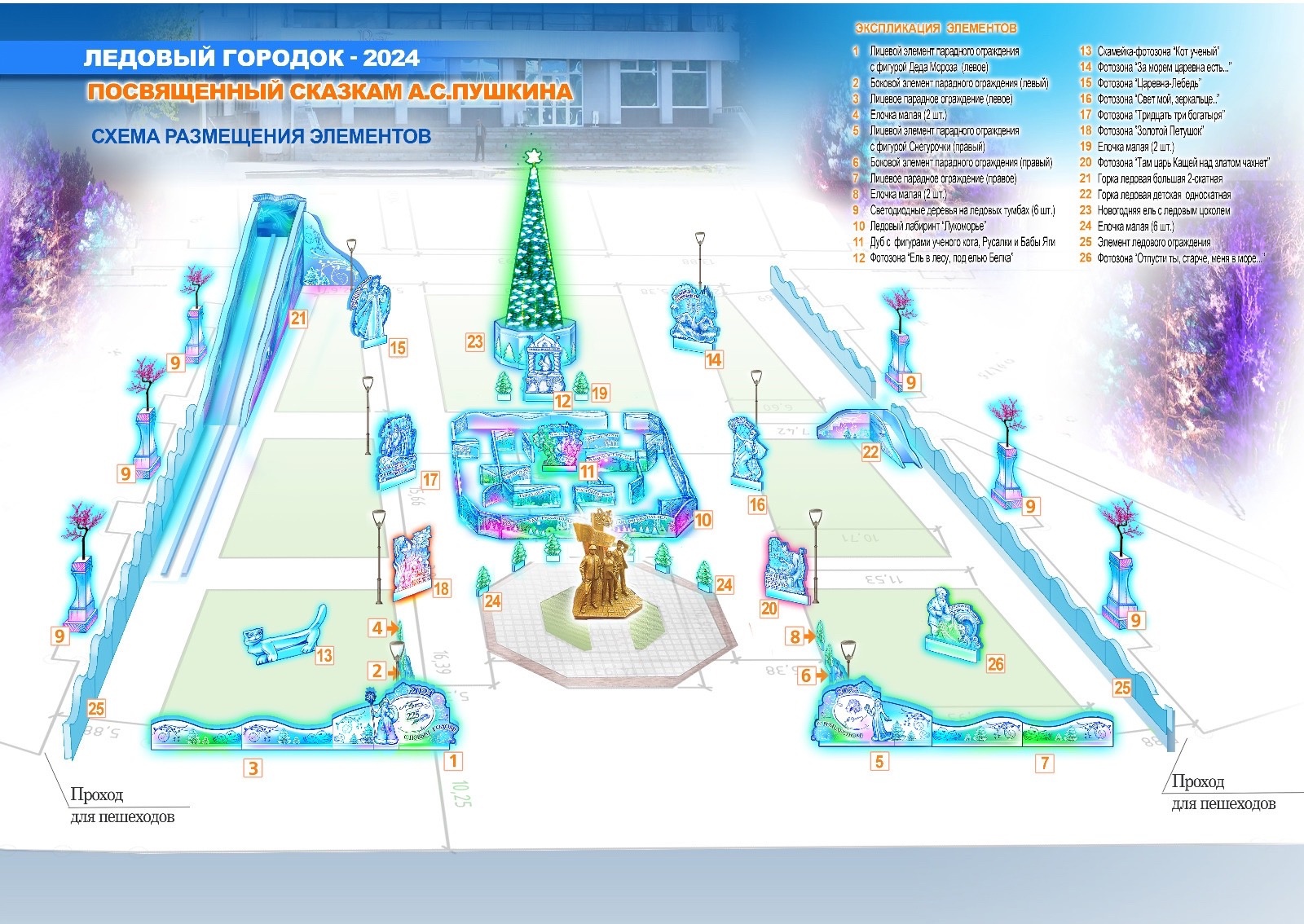 Обустройство ледового городка начнется по погоде. В этом году главной темой станут «Сказки Пушкина». В оформлении городка будут использованы самые известные персонажи любимых сказок.