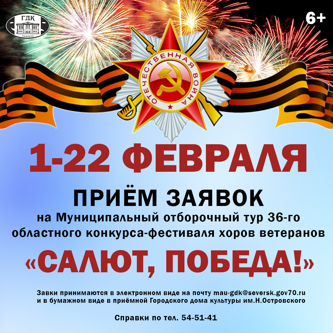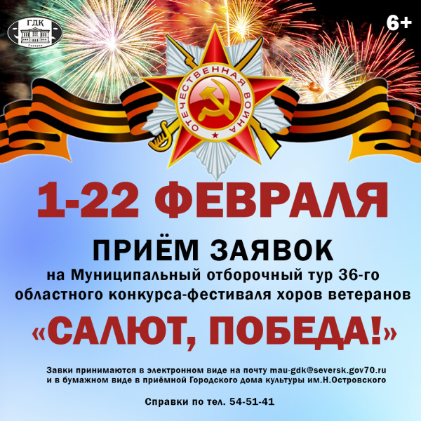 С 1 по 22 февраля продлится прием заявок на Муниципальный отборочный этап областного конкурса-фестиваля хоров ветеранов «Салют, Победа!» на территории ЗАТО Северск. В этом году конкурс пройдёт в 36-й раз и будет посвящён 80-летию Победы советского народа в Великой Отечественной войне.