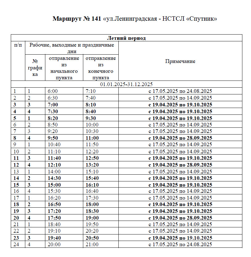 Маршрут № 141 «ул.Ленинградская - НСТСЛ «Спутник» с 19.04.2025 переходит на летнее расписание.
