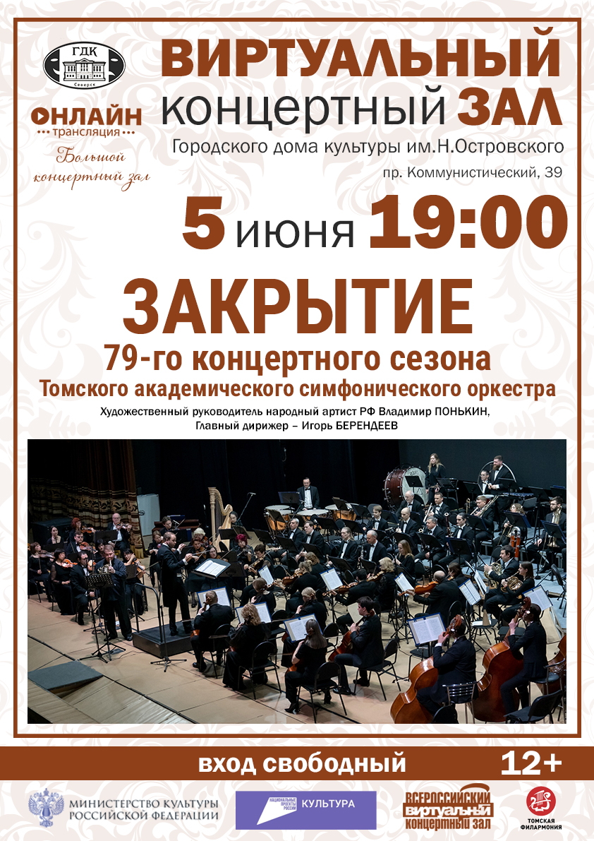 5 июня в 19:00 в Виртуальном концертном зале Городского дома культуры им.Н.Островского состоится трансляция концерта, закрывающего 79-й концертный сезон Томского академического симфонического оркестра (художественный руководитель народный артист России Владимир Понькин) (12+).