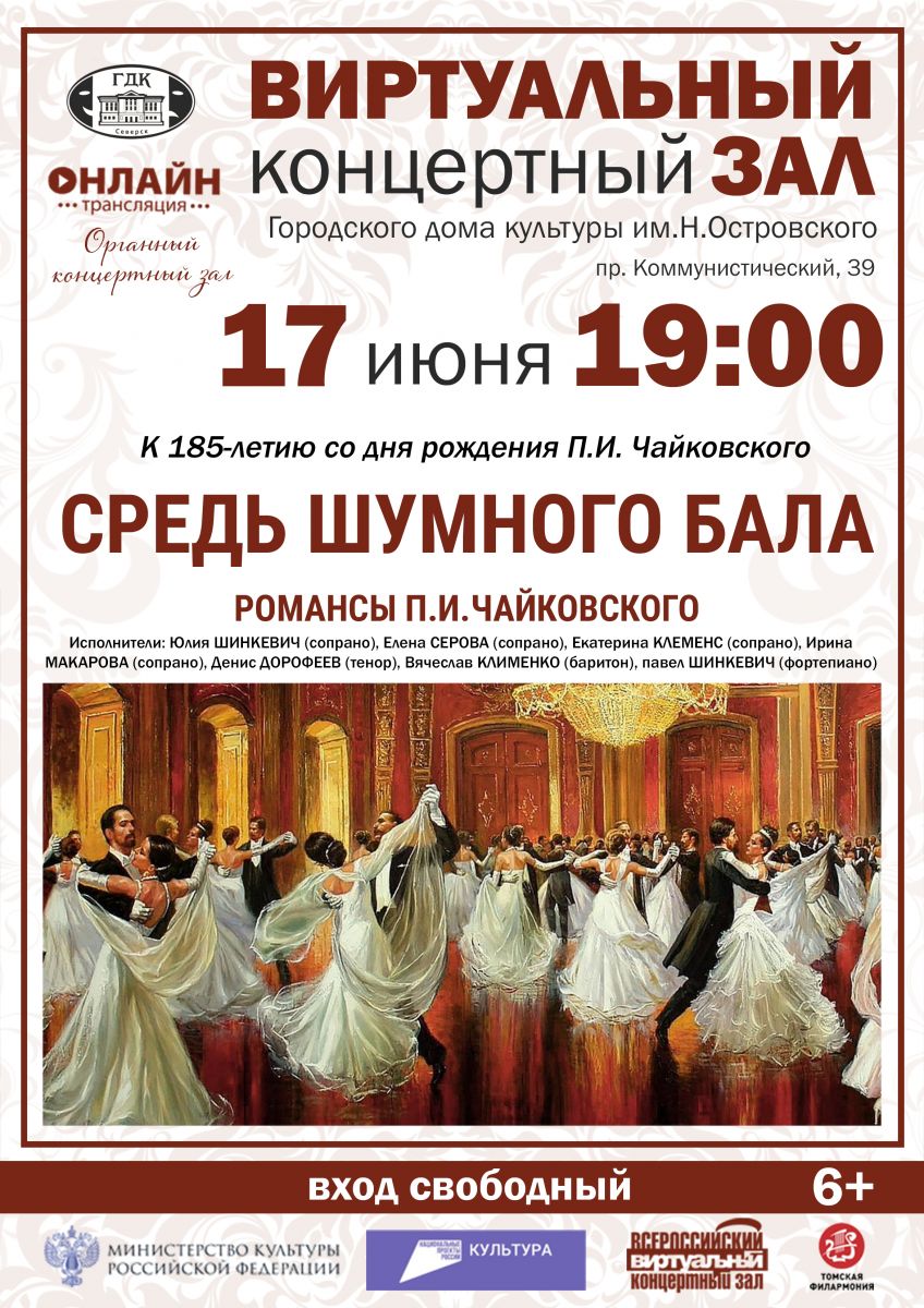 17 июня в 19:00 в Виртуальном концертном зале Городского дома культуры им.Н.Островского состоится трансляция концерта «Средь шумного бала», посвящённого к 185-летию со дня рождения П.И. Чайковского (6+). Вход свободный.