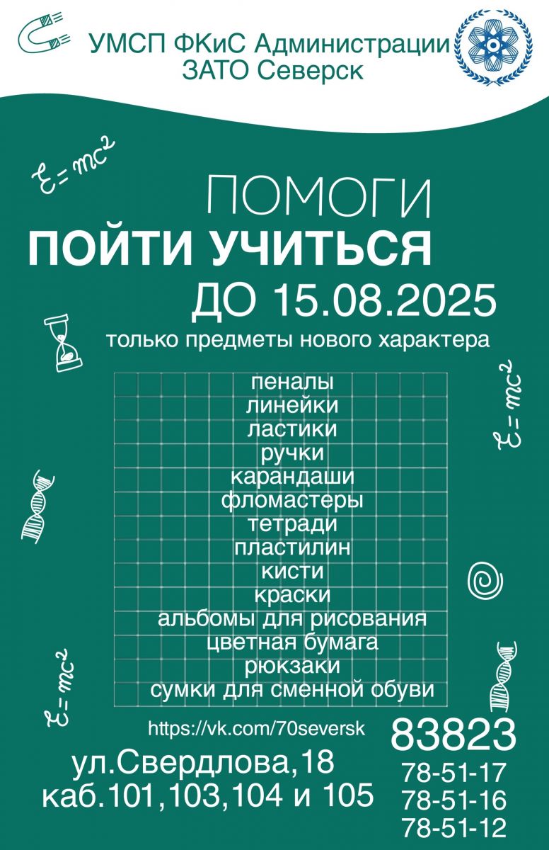 В 2025 году в целях оказания помощи семьям, находящимся в трудной жизненной ситуации, Администрация ЗАТО Северск запускает акцию «Помоги пойти учиться».