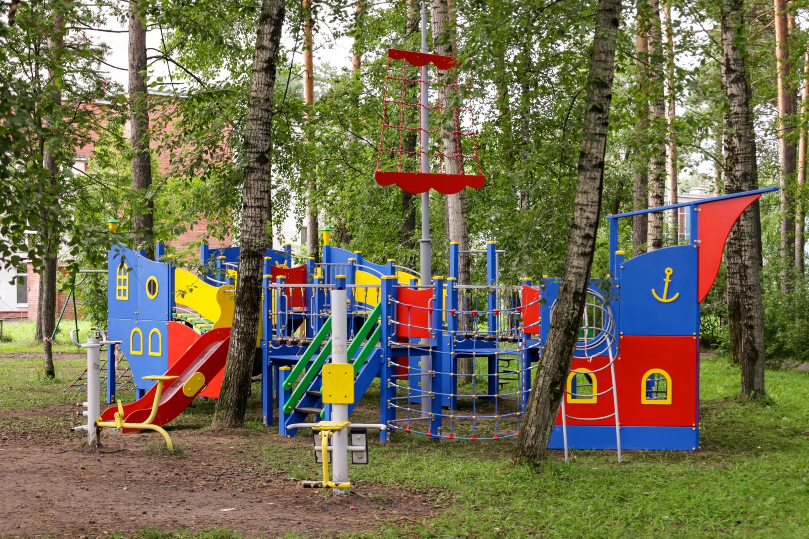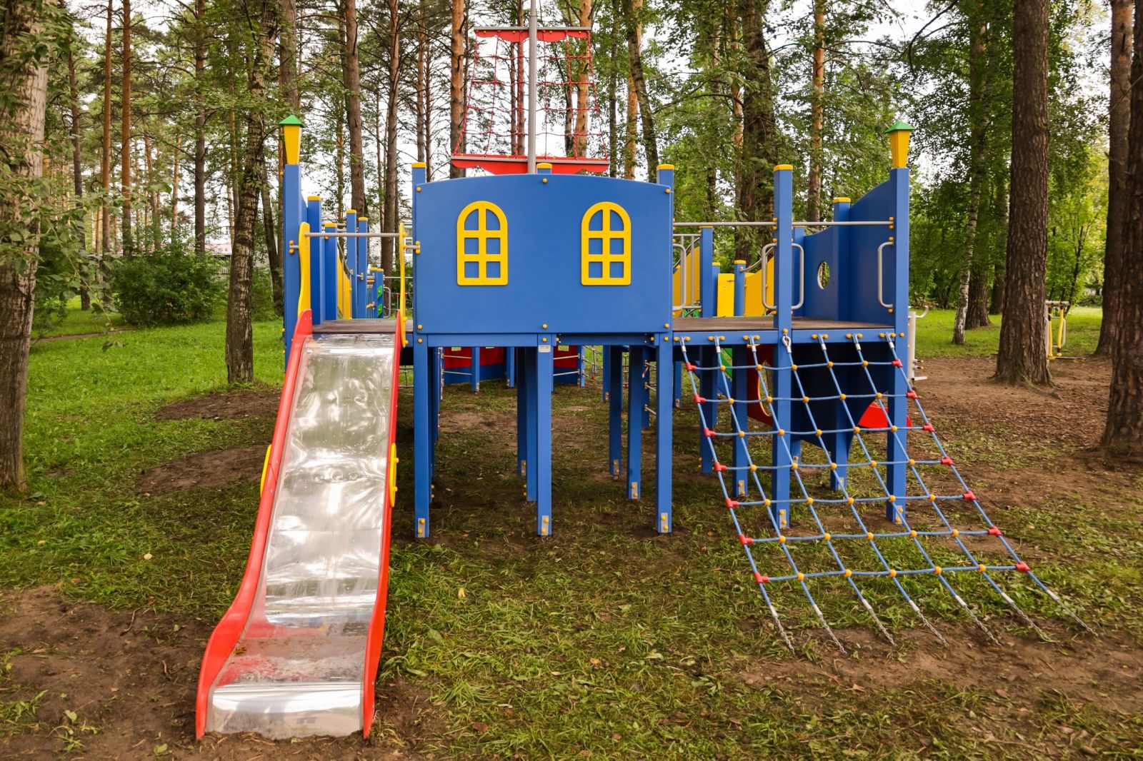 В сквере у дома по проспекту Коммунистическому, 77, обустроены пешеходные и детскую велосипедную дорожки, установлены опоры освещения и детские игровые элементы, спланированы газоны.
