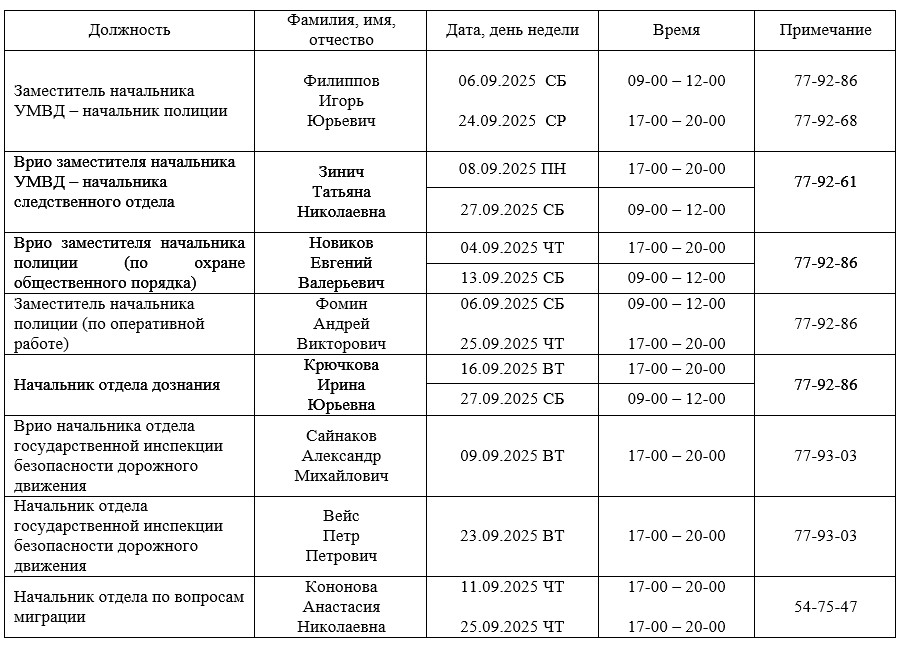 График приема граждан руководящим составом УМВД на сентябрь 2025 года
