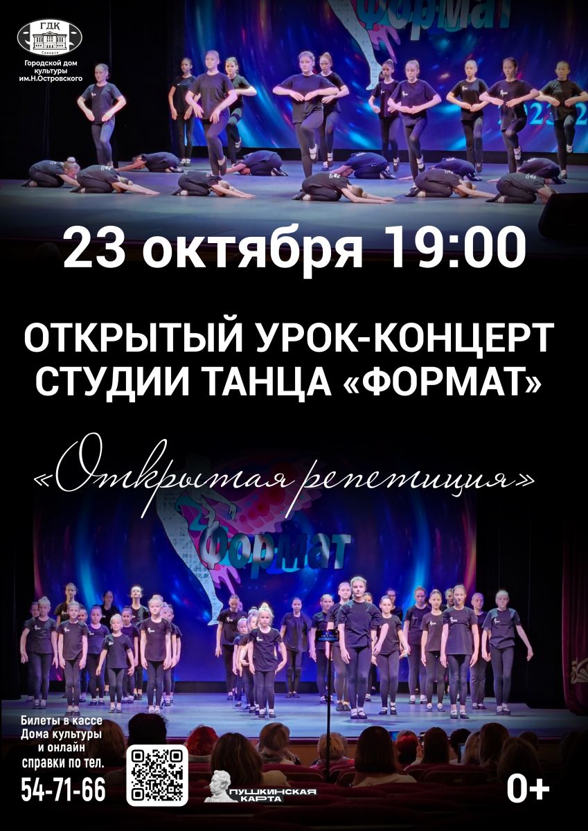 23 октября в 19:00 в Городском доме культуры им.Н.Островского состоится уникальное мероприятие — открытый урок-концерт «Открытая репетиция» (0+) Студии танца «Формат».